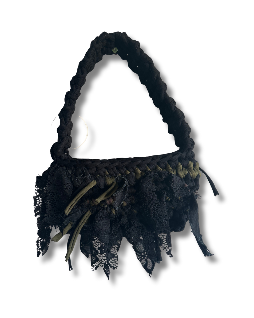 Handhekkluð taska úr endurunnu T-shirt garni og blúndu.